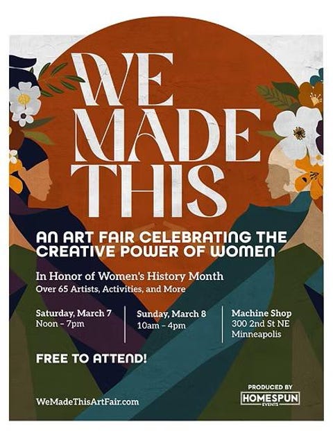 March 7 Noon-7:00 & March 8 10:00-4:00 An Art Fair celebrating the creative power of women! Over 65 women and non-binary artists, hands-on activities, and more in celebration of women's history month. At the historic Machine Shop in NE Minneapolis.