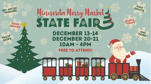 Join us at the 3rd Annual Minnesota Merry Market this December 13-14 & 20-21 at the State Fair North End Event Center. 80+ artists and vendors, food trucks, train rides, santa visits, kids crafts.