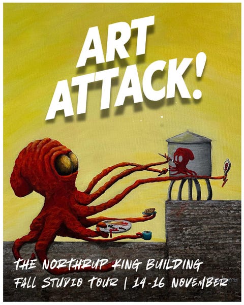 The Northrup King Building's highly anticipated fall open studio event showcases and celebrates four floors of amazing art and the artists who make up our creative community. Meet the artists, find a treasure for your home, learn about the creative process with live art demos, immerse yourself in interactive art experiences, get a start on your holiday shopping with unique gifts. Art Attack! 2025 Friday | Nov 14 | 5-9pm Saturday | Nov 15 | 12-8pm Sunday | Nov 16 | 12-5pm