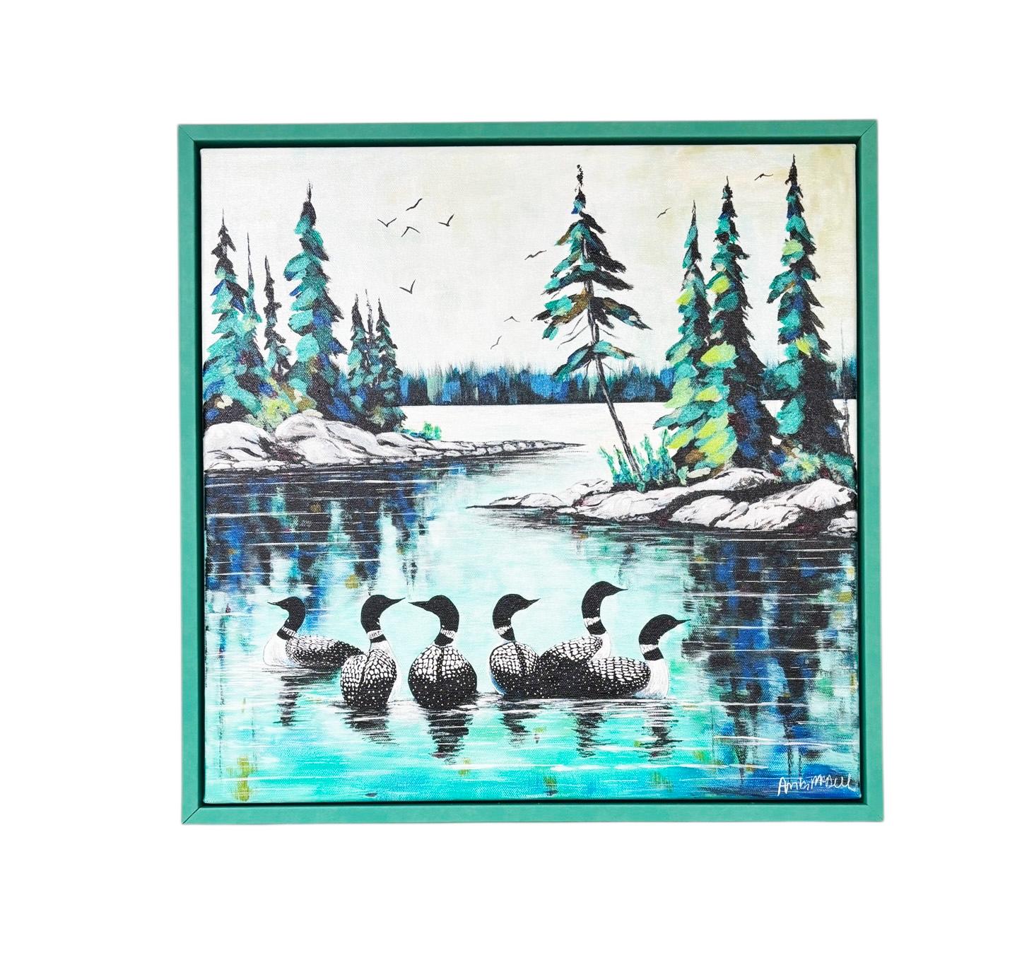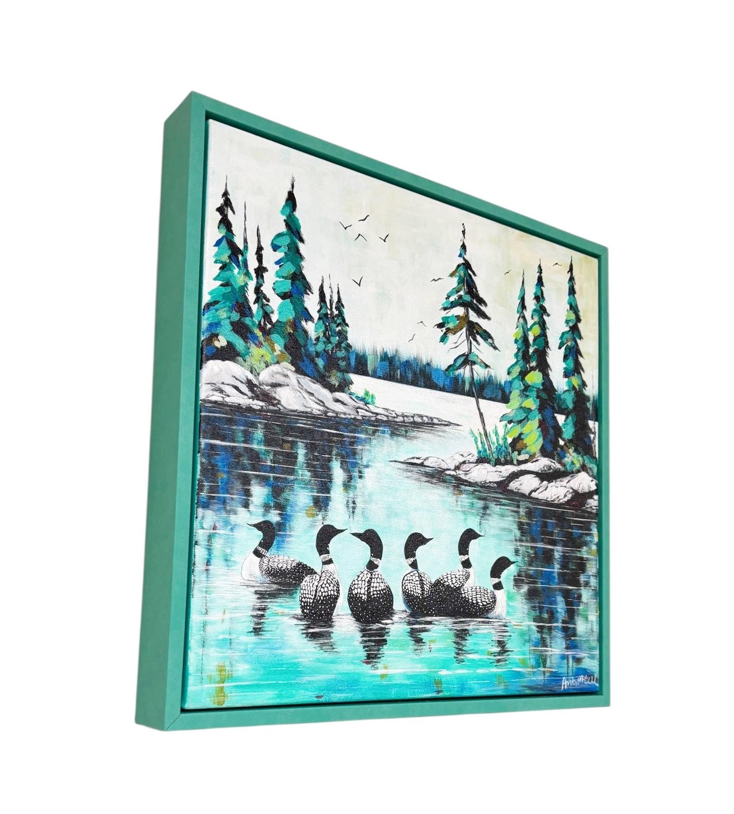 Immerse yourself in tranquility with this beautiful painting that captures the enchanting charm of nature. This artwork features a serene scene of six common loons, gracefully floating on a tranquil aqua-colored lake. Their distinctive black-and-white patterned bodies are beautifully rendered, making them the focal point of this idyllic setting.