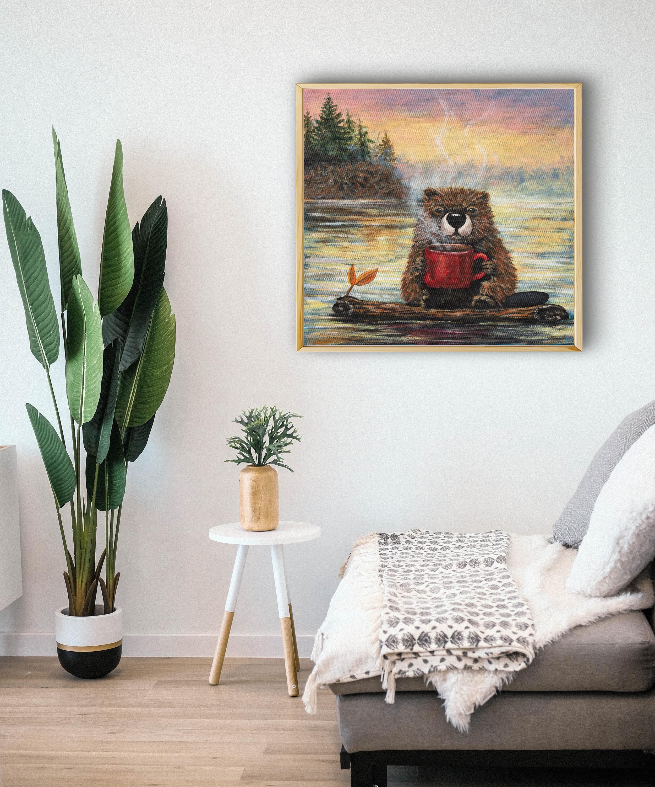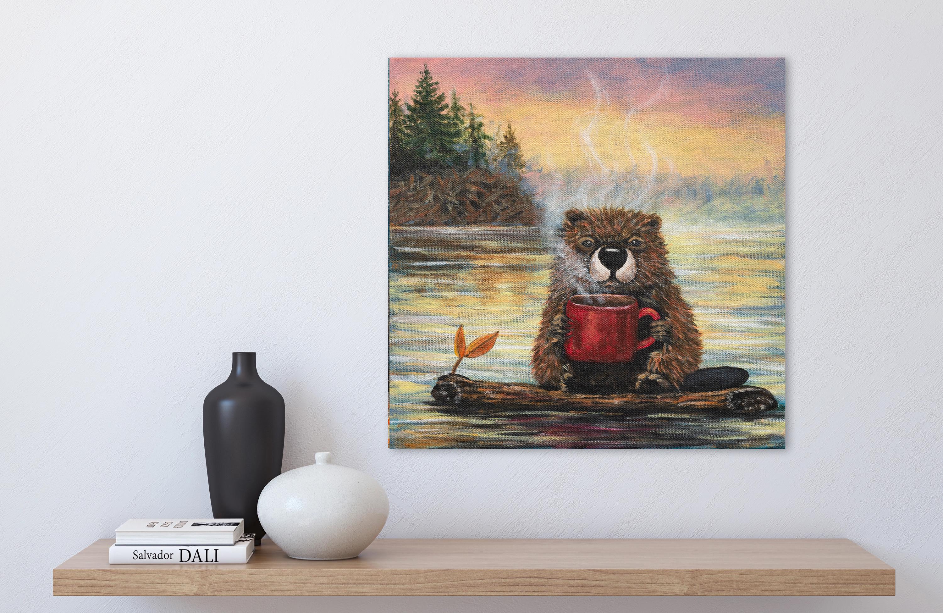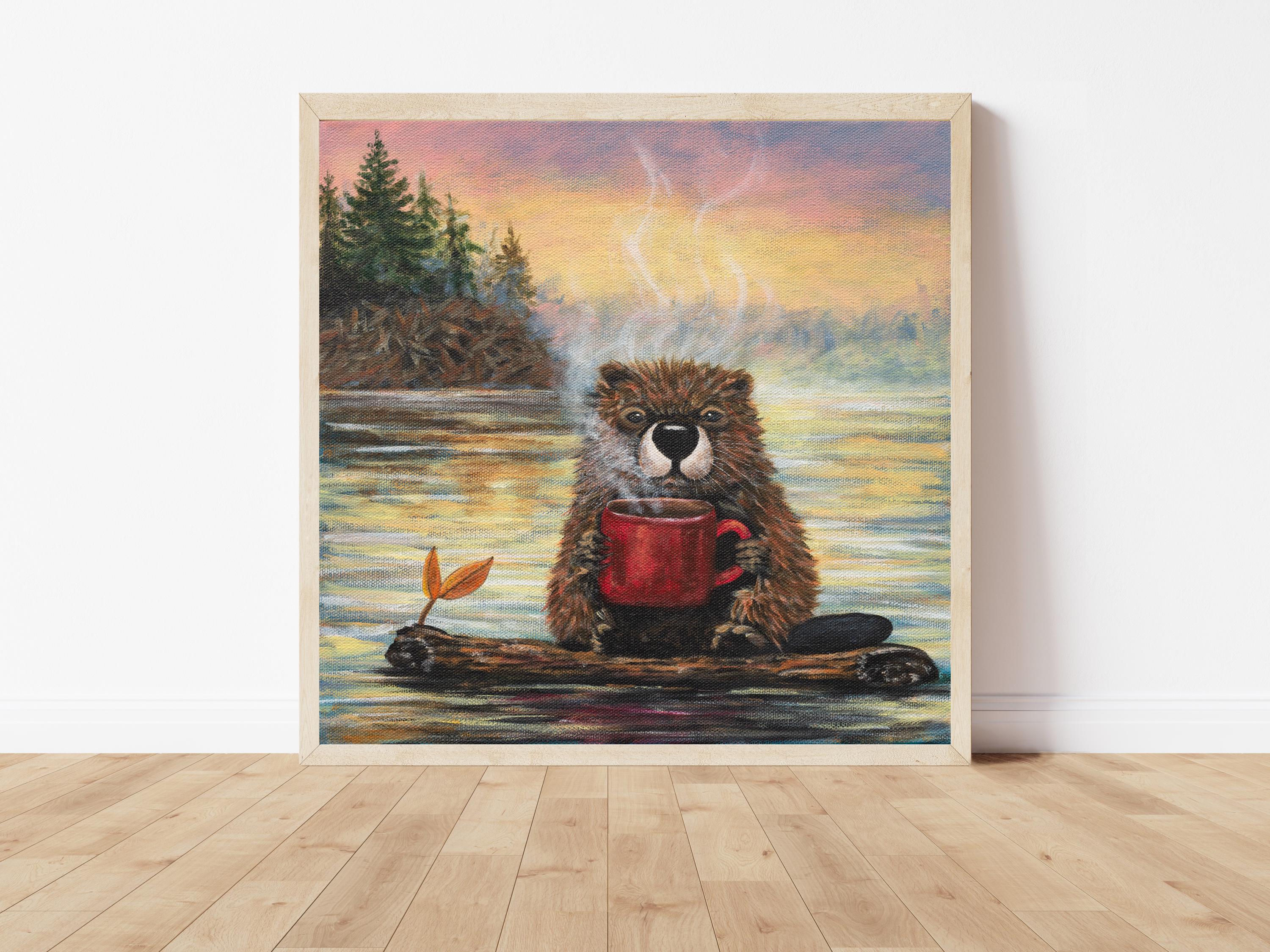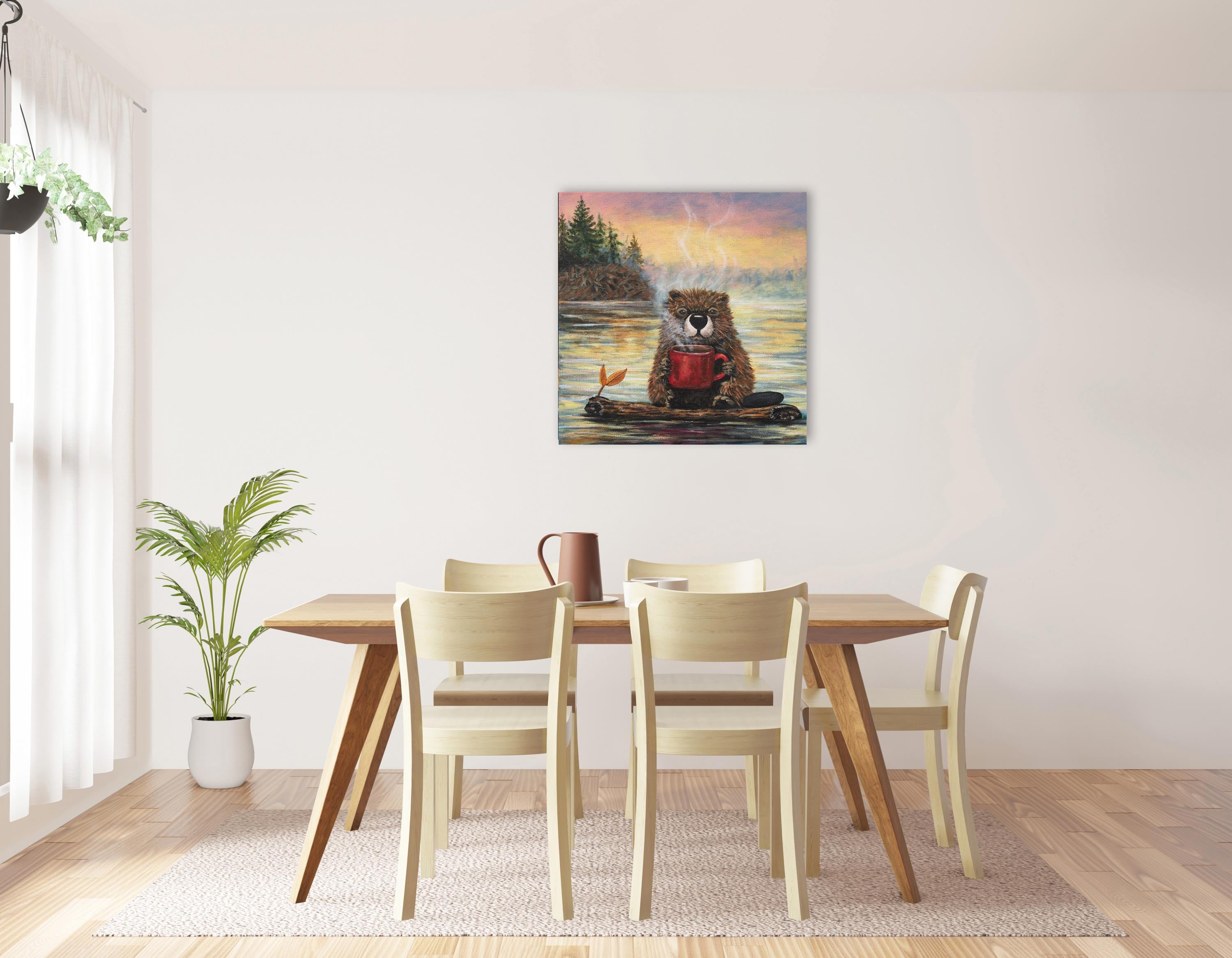 With warm sunrise tones reflecting across the lake and soft steam curling into the crisp morning air, this piece blends cozy comfort with a touch of humor. The expressive details and rich textures bring personality to the scene, making it both heartwarming and memorable.